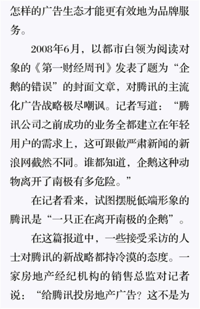深读之后发明,其实全书真正的焦点在于透过腾讯可以视察到的中国企业逻辑,其中许多基于国情而降生的特殊能力,已往或受诟病或被追捧,而本书作者可以以越发客观的姿态对其进行剖析,这无疑是一种今世创颐魅者和企业家应当学习的姿态和能力。