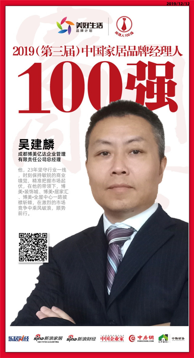 本网讯(记者报道)2019年12月12日,“致敬追梦人?致远中国梦-2019(第三届)中国地产新时代盛典暨2019中国家居新浪潮盛典”在北京举行。盛典现场,“2019(第三届)中国家居品牌经理人评选”结果揭晓。博美总经理吴建麟获“2019中国家居品牌经理人100强”。