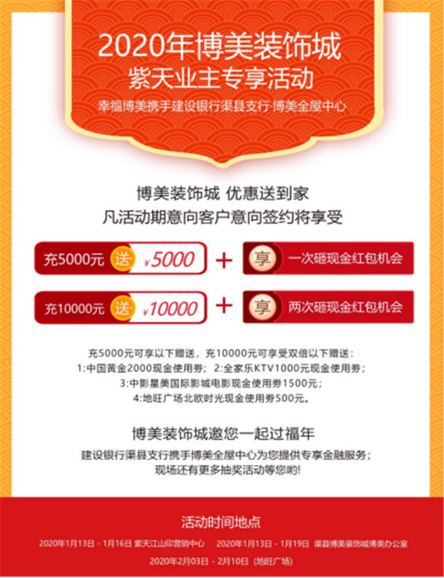 Ϊ»ØÀ¡¿í´óÏû·ÑÕß¶Ô²©ÃÀµÄÐÅÀµ£¬ÇþÏØ¡°²©ÃÀ©qÈ«ÎÝÖÐÐÄ¡±Ð¯ÊÖ½¨ÉèÒøÐÐÇþÏØÖ§ÐÐÓÚǰ²»¾Ã¿ªÕ¹ÁËÖ÷ÌâΪ¡°Ð´º×ÏÌìÒµÖ÷רÏíÔ˶¯¡±£¬Ô˶¯ÄÚÈݰüÀ¨£ºÒ»¡¢µ½µê¼´ËÍÖйú»Æ½ð¼ÛÖµ1980ÔªÍÕÈÞ±»Ò»Ì×£¨Æ¾×ÏÌ칺·¿ÌõÔ¼µ½Ö¸×¼Ê±¼äËùÔÚ¾ù¿ÉÏíÊÜ£©¡£¶þ¡¢ÒâÏò¿Í»§ÒâÏòǩԼ½«ÏíÊܳä5000ÔªËÍ5000Ôª²¢ÏíÒ»´ÎÔÒÏÖ½ðºì°üʱ»ú¡¢³ä10000ÔªËÍ10000 Ôª²¢ÏíÔÒÁ½´ÎÏÖ½ðºì°üʱ»ú¡£Èý¡¢³ä5000Ôª¿ÉÏíÒÔÏÂÔùËÍ£¬³ä10000Ôª¿ÉÏíÊÜË«±¶ÒÔÏÂÔùËÍ£º1.Öйú»Æ½ð2000ÔªÏÖ½ðʹÓÃȯ£»2.È«¼ÒÀÖKTV1000ÔªÏÖ½ðʹÓÄ»£»3.ÖÐÓ°ÐÇÃÀ¹ú¼ÊÓ°³ÇÓ°Ï·ÏÖ½ðʹÓÃȯ1500Ôª£»4.µØÍú¹ã³¡±±Å·Ê±¹âÏÖ½ðʹÓÃȯ500Ôª¡£