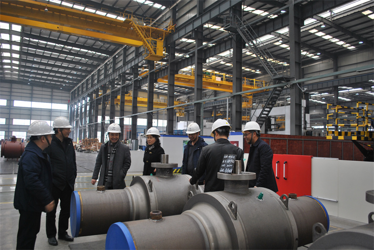 在飞球公司工厂车间里 ,公司副总经理曹国强为列位来宾介绍了公司今年的77号国家管网的订单锻钢球阀以及种种全焊式球阀 ,来宾越发清晰的了解到了飞球种种产品的特性以及用途 。工厂里中国第一台全焊式48寸600磅阀门引起了众人的兴趣 ,一行人纷纷拍照留念并夸赞在当年的情况下能做出这样的产品实属不易 。