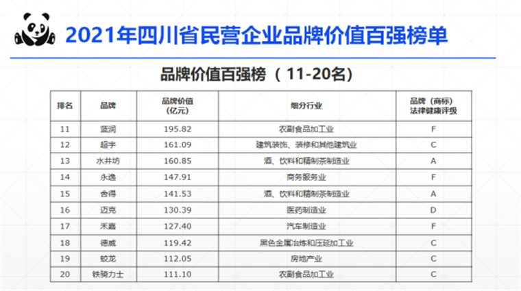 ËÄ´¨ÃñÓªÆóÒµ¡°Æ·ÅƼÛÖµ°ÙÇ¿¡±°ñµ¥ÓÉËÄ´¨Ê¡¹¤ÉÌÒµÁªºÏ»áÖ÷µ¼£¬ÖÐÑë²Æ¾´óѧ˰Êռƻ®ÓëÖ´·¨Ñо¿ÖÐÐÄ¡¢ËÄ´¨Ê¡ÖªÊ¶²úȨЧÀÍÓëÁ¢ÒìÉú³¤Ôö½ø»á¼ÓÈëÌåÀý¡£Èë°ñÆóÒµÆ·ÅÆ¼ÛÖµ×ܼƴï8027.57ÒÚÔª£¬Æ·ÅƼÛÖµÁè¼Ý°ÙÒÚµÄÃñÓªÆóÒµÓÐ20¼Ò£¬°ÙÇ¿°ñµ¥Æóҵƽ¾ùÆ·ÅÆ¼ÛÖµ´ï280.28ÒÚÔª¡£