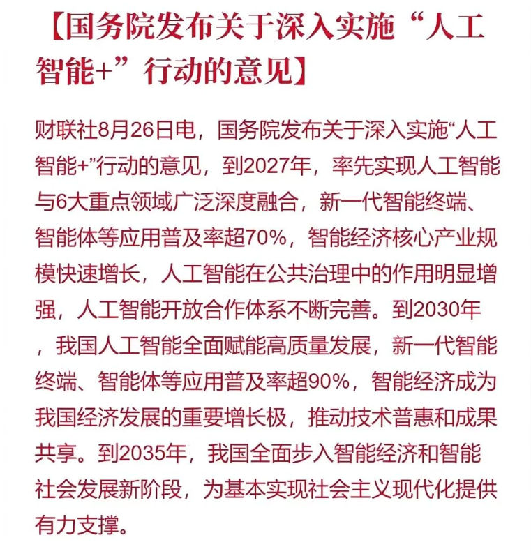 ÈÕǰ£¬¹úÎñÔºÓ¡·¢¡¶¹ØÓÚÉîÈëʵʩ¡°È˹¤ÖÇÄÜ+¡±Ðж¯µÄÒâ¼û¡·£¬Ìá³ö¡°Èý²½×ß¡±Éú³¤Ä¿±ê£¬2027ÄêAIÓ¦ÓÃÆÕ¼°Âʳ¬70%£¬2030Ä곬90%£¬ÖÇÄܾ¼Ã³ÉΪ¾¼ÃÉú³¤ÖØÒªÔö³¤¼«£¬2035ÄêÈ«Ãæ²½ÈëÖÇÄܾ¼ÃºÍÖÇÄÜÉç»áÉú³¤Ð½׶Ρ£
