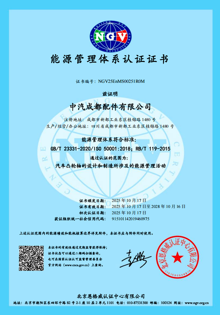 作为汽车凸轮轴领域的主干企业,中汽成配始终将绿色、低碳与可连续生长理念深度融入日常运营。此次乐成获得能源治理体系认证,标记着公司在精细化、系统化的能源治理上取得了要害突破。这一认证不可是权威认可的“绿色通行证”,更是中汽成配迈向高质量、可连续生长新阶段的重要里程碑。