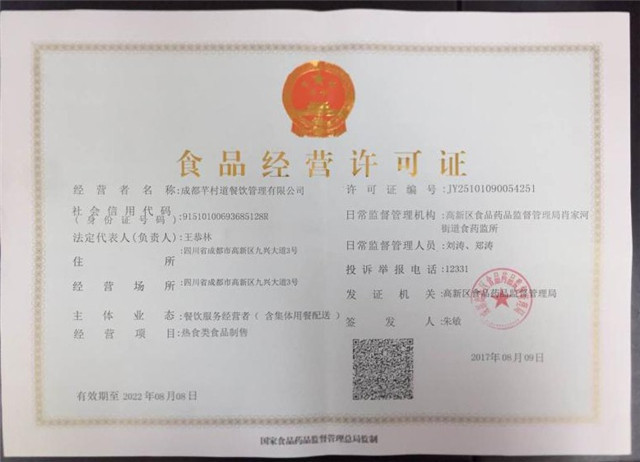 本网讯(李婷婷报道)历时近三个月的不绝革新提升,成都芊村道餐饮治理有限公司(以下简称“芊村道”)于近日乐成延续集体用餐配送许可证,凭该证芊村道将继续为成都会大中小型企业、会展外来来宾、各巨细型集会类继续供餐,预计效劳人次将抵达数十万人。据悉,此证成都会高新区仅5家餐饮单位获得,有效时限将由最初的三年延续至五年。