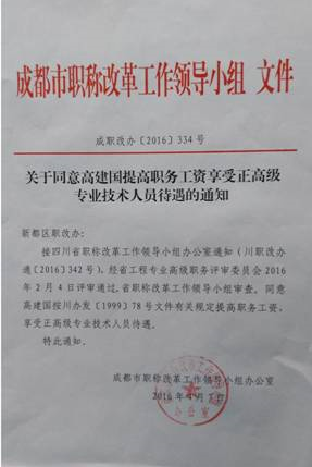 本网讯(王珊珊报道)2016年2月 4日 ,高建国总经理顺利通过了四川省工程专业高级职务评审委员会评审。并经省职称革新事情领导小组审查 ,同意其享受正高级专业技术人员待遇。